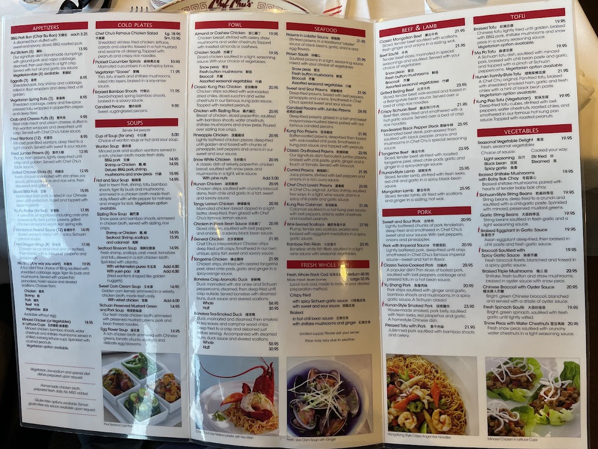 Chef Chu’s menu offers a straightforward blend of classic Chinese dishes and familiar American Chinese favorites, creating an approachable experience that suits a variety of dining occasions. Whether you’re stopping by for a casual lunch or settling in for a relaxed dinner, the menu balances comforting flavors with traditional preparations.